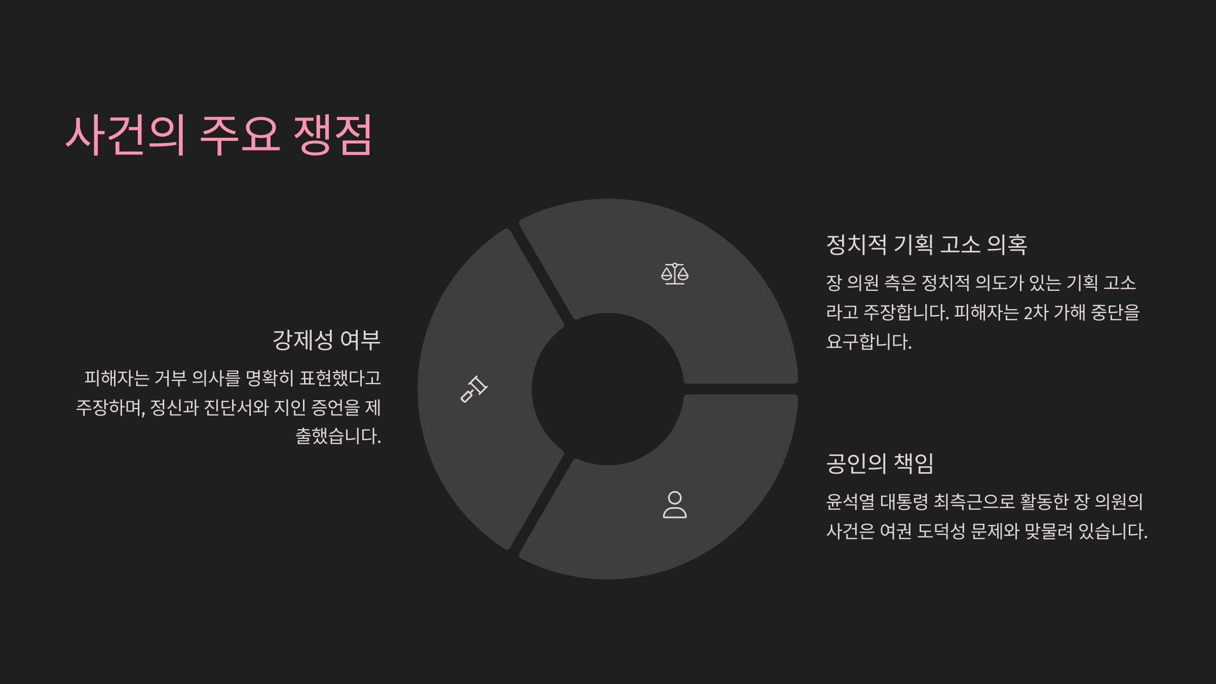 이번 사건의 핵심은 ‘강제성이 있었는가’, 그리고 ‘피해자의 진술이 얼마나 일관되고 구체적인가’입니다.